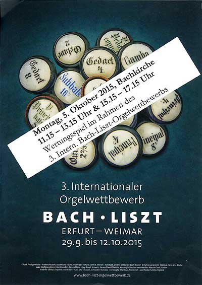 Der Internationale Bach-Liszt-Orgelwettbewerb mit einem Preisgeld von 12000 Euro für den 1. Preisträger wurde am letzten Dienstag in Erfurt eröffnet. Fast 60 junge OrganistInnen aus aller Welt haben sich beworben mit einer CD, auf der Pflichtstücke eingespielt werden sollten. Eine Teiljury wählte 15 Teilnehmer aus zur Teilnahme am Wettbewerb. In der ersten Runde spielten die Teilnehmer in Waltershausen und in der Erfurter Predigerkirche anonym vor einer Jury bestehend aus international renommierten Organisten. Dabei zeigte sich im Teilnehmerfeld ein außergewöhnlich hohes Niveau.
